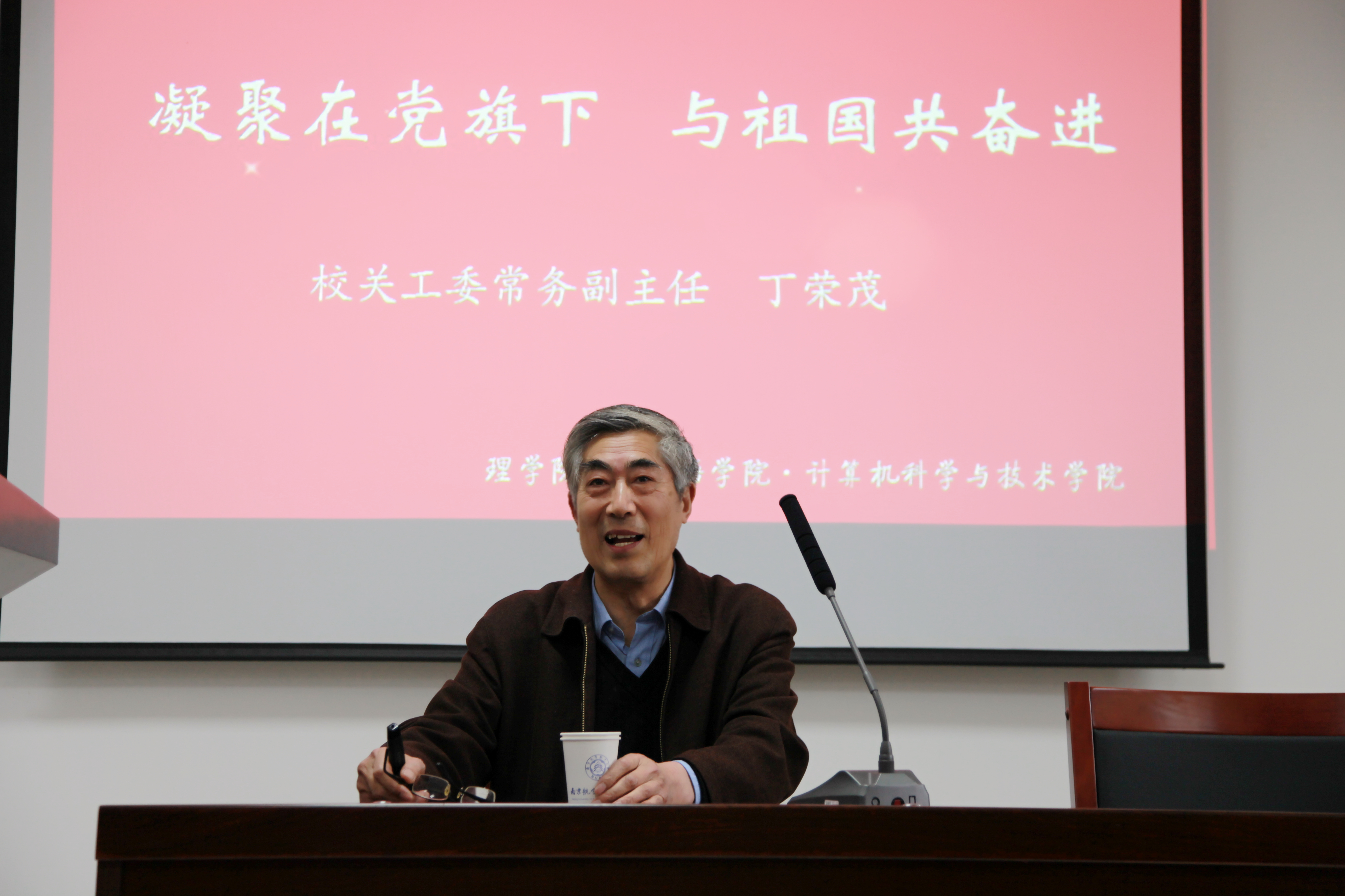 为积极响应党中央“学党章党规、学系列讲话,做合格党员”号召,推进落实我校“党员先锋计划”,4月27日,我院与理学院、计算机科学与技术学院联合开展的“两学一做”主题教育暨毕业生党员在校最后一次党课活动在将军路校区开展。本次活动主题为“凝聚在党旗下,与祖国共奋进”,邀请到校关工委常务副主任丁荣茂担任主讲人,来自三个学院的150余名学生党员参加了教育活动。