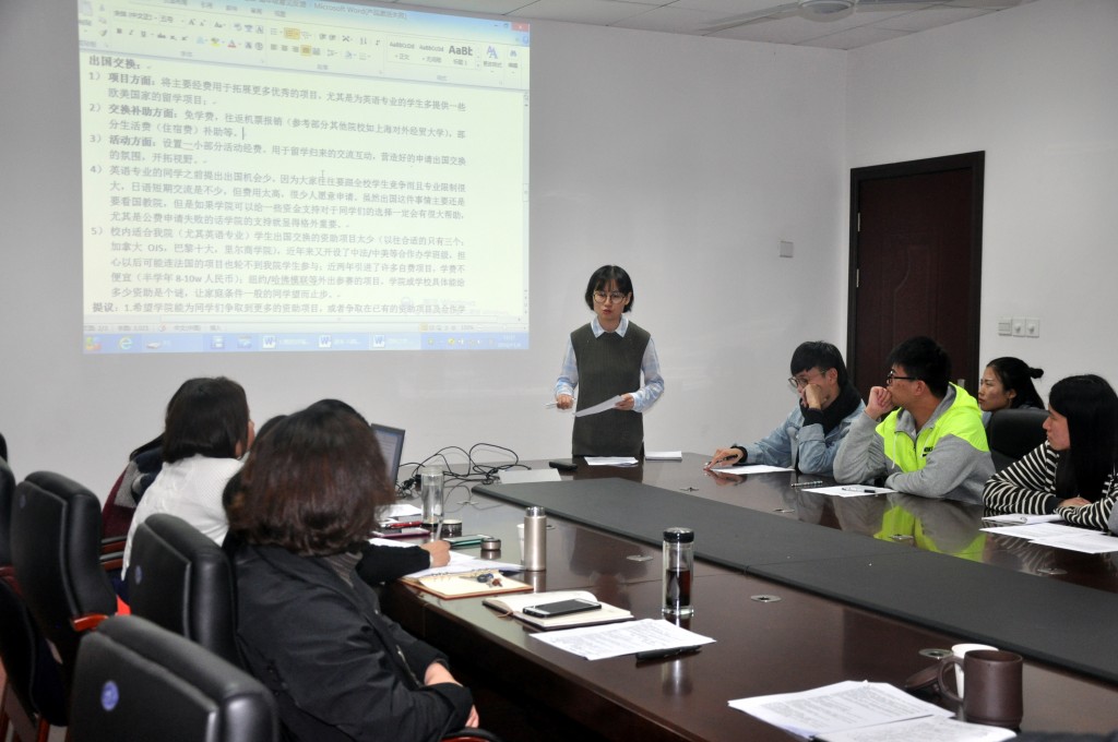 经过前期广泛的意见征集与整理,学生代表们围绕师生共同关注的课程设置、课堂教学、专业分流、本科生导师制、实习实践安排、国际化发展等话题踊跃发言,分享了现状调查结果和同学们的意见、建议。在课程设置上,英语专业学生代表提出了部分课程内容上略有重复,日语专业学生建议低年级的专业课程应有所增加;在课堂教学上,有同学建议部分老师的课堂安排更加合理,课程考核方法需提前明确等问题;对于学院即将实施的本科生导师制,学生代表们在导师的选择方法、考核方式等方面提出了具体建议;在国际化发展上,同学们期待学院多争取适合我院学生的交换项目,更加支持模拟联合国大会等国际性活动,并有机会开展与留学生的交流活动;大四学生代表也积极提出希望得到学院更加合理地安排课程时间以利于学生进行有针对性的、高质量的实习等建议。
