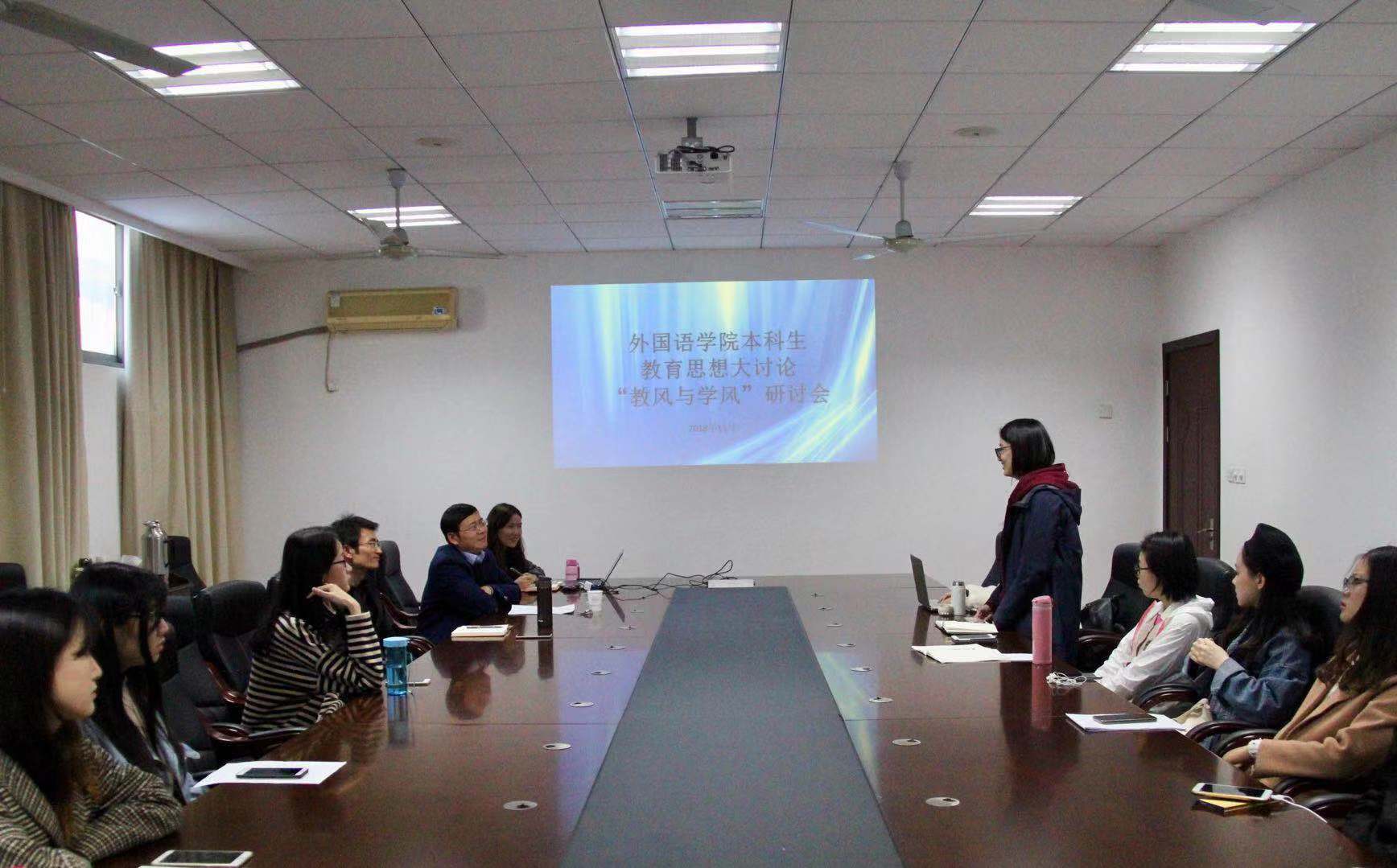 11月9日下午,必赢国际437官网本科生各年级开展了2场教风与学风专题研讨会,英语系主任姜礼福老师、白雪花老师,日语系钟勇老师,各年级辅导员,各班班长、学习委员及学生代表参加了本次研讨会,就如何更好助力我院学风教风建设发展进行了深入的交流和讨论。