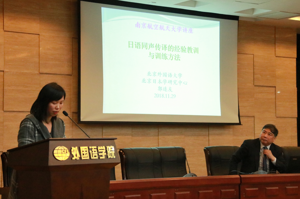 11月29日(周四)19时许,北京外国语大学日本学研究中心主任、博士生导师、中国日语教学研究会副会长郭连友教授在必赢国际437官网国际会议中心举办了题为“日语同声传译的经验教训与训练方法”的学术讲座。我院日语系周菲菲老师主持了本次讲座,学院徐以中副院长、日语系师生及部分英语专业师生聆听了此次讲座。