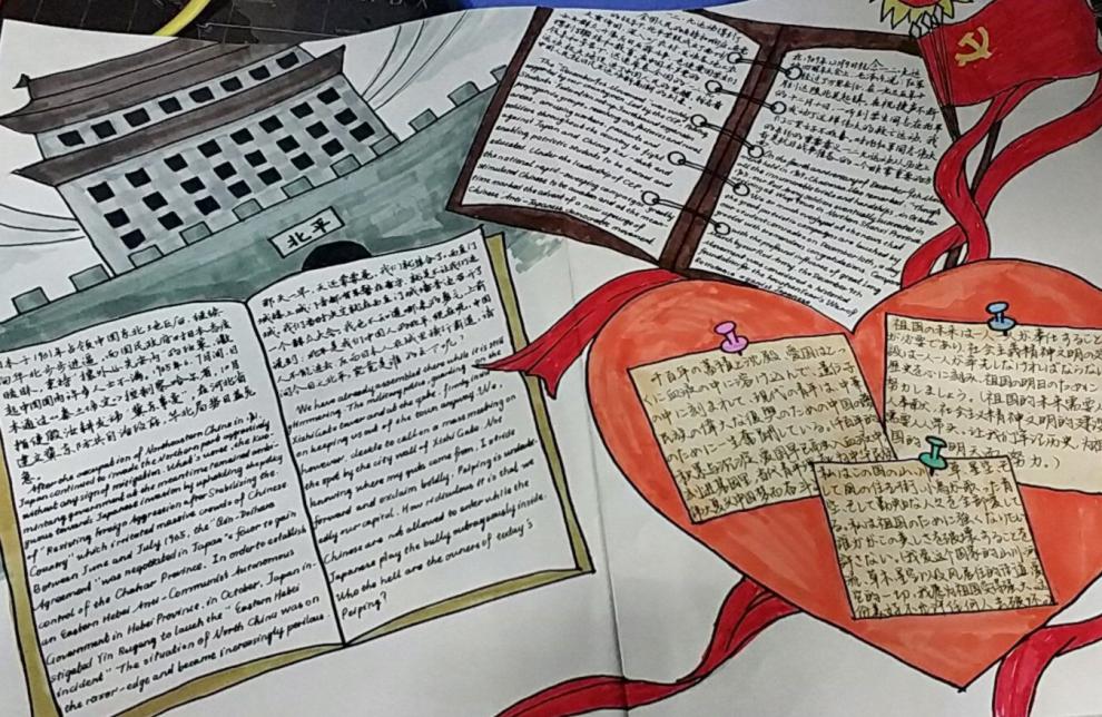 17级团总支组织年级同学参与绘制爱国主题海报。海报内容与专业特色相结合,第一部分为“一二·九”事件背景、经过、影响和评价四个方面的英文翻译,第二部分为日语系同学用外语写下的感想。同学们邀请了英语系蔡咏春老师对翻译部分进行指导,在负责誊写、绘画同学的齐心协力下,年级完成了一份精心制作的外文爱国主题海报,由衷表达了赤忱的爱国之情。