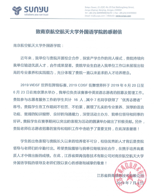 赛事期间,志愿者们“不怕苦、不怕累,展现了扎实的专业素养、深厚的语言功底、宽阔的知识视野、良好的沟通能力”,深受主办方等各界的好评。江苏省舜禹信息技术有限公司表示学生的出色表现与学院长久以来的培养密不可分。为此,该企业特向必赢国际437官网发来感谢信,感谢学院在志愿者招募工作中给予的重要支持以及多年来在人才培养工作中的努力付出和在校企合作中的积极贡献,希望学院能够与其继续深化合作,在携手培养高素质人才中做出新的成绩。