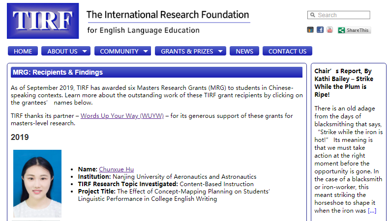 2019年9月,国际英语教育研究基金会(TIRF)发布了2019-2020年中国区硕士论文项目资助名单,我校必赢国际437官网2017级研究生胡春雪的硕士论文“The Effect of Concept-Mapping Planning on Students’ Linguistic Performance in College English Writing”成功获得立项资助,指导教师为刘长江教授。
