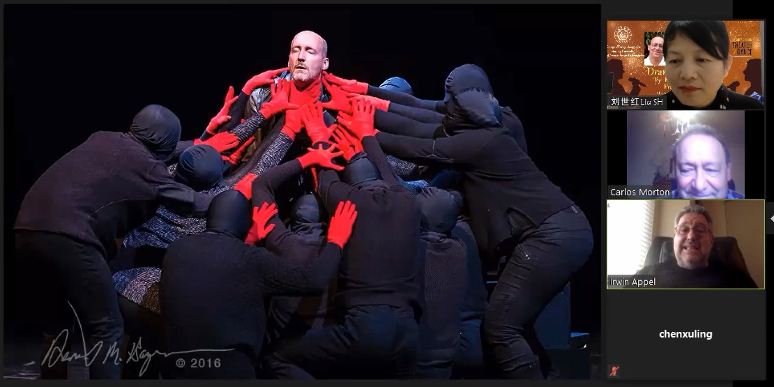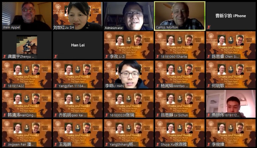 在线讲座由必赢国际437官网副教授刘世红策划和主持,必赢国际437官网院长范祥涛教授致欢迎辞。讲座分为两场,第一场由Carlos Morton教授主讲,他结合莎士比亚最有影响力的戏剧作品《哈姆雷特》介绍了亚里士多德的戏剧理念、戏剧的起源、戏剧的各要素,如主角、反面角色、情节、事件、矛盾冲突、高潮等,深入浅出,娓娓道来;第二场由Irwin Appel教授主讲,他从导演的角度探讨了戏剧《哈姆雷特》的主题和多种舞台表现手法,并展示了他自己创办的剧团表演、自己导演的戏剧《哈姆雷特》的精彩剧照和片段。身为演员的Appel教授还亲自朗诵了几段戏剧主角哈姆雷特的经典台词,情感充沛,震撼人心。两位还对戏剧这种文学体裁、戏剧作品《哈姆雷特》进行了深度挖掘和多维度的拓展,听众们深受启迪,得到了美好的艺术熏陶。在讲座提问环节,学生表现出色,他们围绕戏剧哈姆雷特的现实意义、现代戏剧的意义、死亡哲学等内容,通过语音、或者聊天室打字踊跃发言、频频发问。两位教授们对学生们高质量有深度的提问非常赞赏,并耐心地进行解答和交流,气氛十分活跃。讲座长达两个多小时,但大家仍觉得意犹未尽。在英文歌曲《友谊地久天长》)的美妙旋律中,讲座落下帷幕,画上了圆满句号。