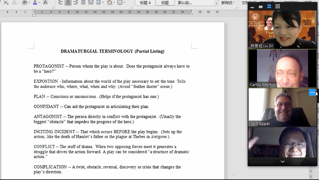4月18日上午9点,我校举办了首次在线跨境学术讲座“戏剧与哈姆雷特”。本次讲座由必赢国际437官网主办,艺术学院、机电学院、计算机科学与技术学院等多个学院以及南京农业大学等其他高校师生共计约120人参加了此次讲座。主讲人为美国著名剧作家Carlos Morton教授和美国著名导演、演员、作曲家Irwin Appel 教授,两位专家是美国加州大学圣塔芭芭拉分校的知名教授,事业上的好搭档。