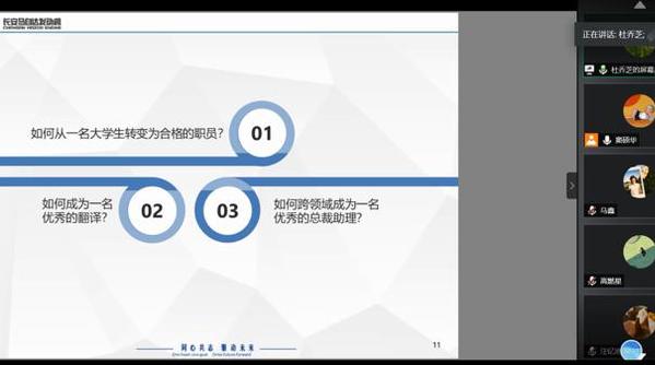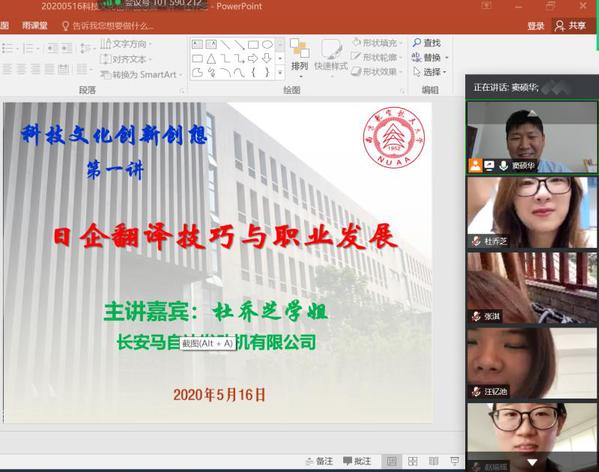 《科技文化创新创想》是必赢国际437官网日语系设置的精品企业课程,由日语系邀请几位企业成功人士分不同主题进行授课。5月16日上午,课程第一讲通过腾讯会议模式开启,主题为《日企翻译技巧与职业发展》,主讲人为南京长安马自达发动机有限公司总裁助理杜乔芝。