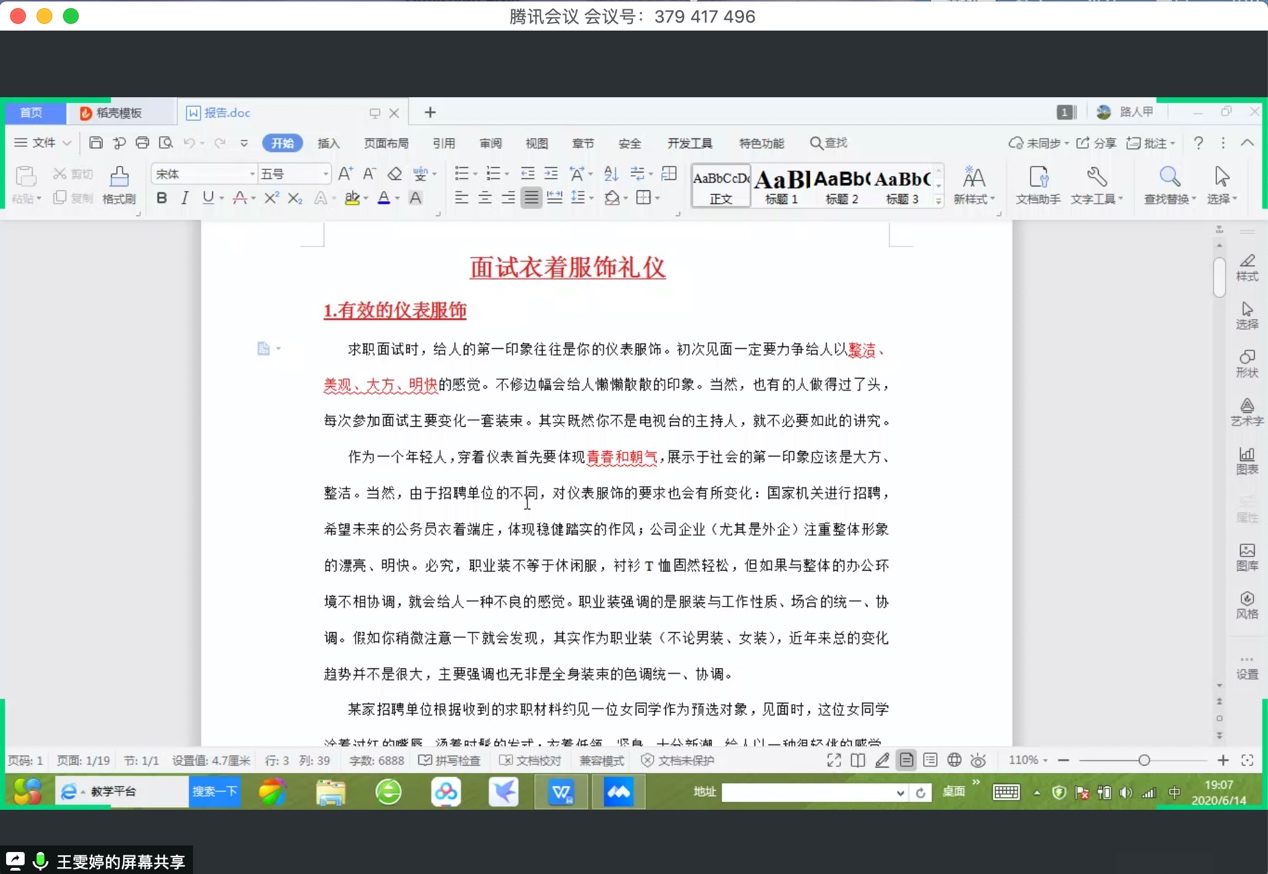 6月14日晚,艺术学院联合必赢国际437官网通过腾讯会议平台开展职业素质训练营 “面试服饰妆容和礼仪技巧”主题讲座,讲座邀请艺术学院美术系专业教师王雯婷老师为同学们进行礼仪、仪容、服饰三方面的讲解与指导,艺术学院、必赢国际437官网全体本研准毕业班学生参加了本次讲座。