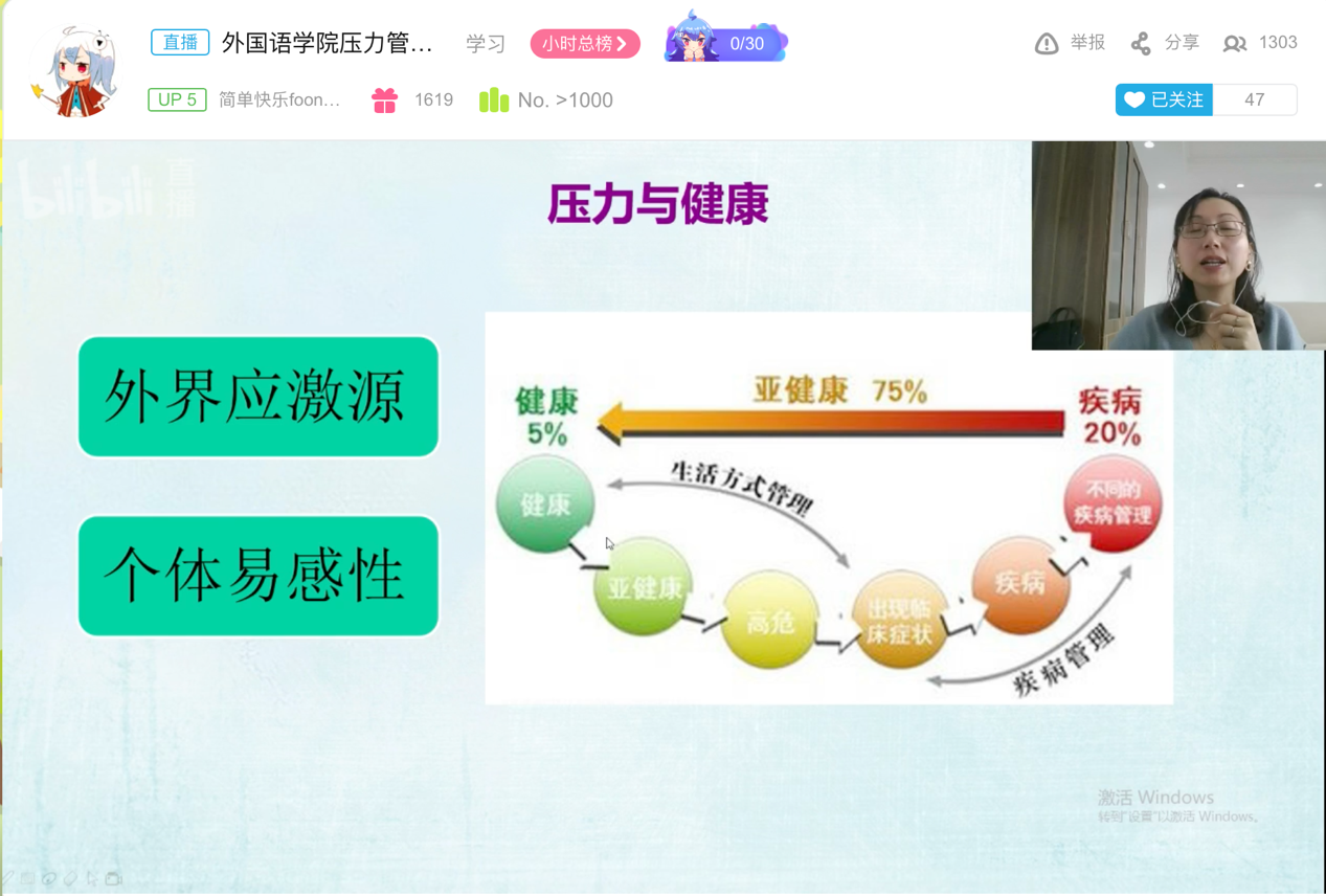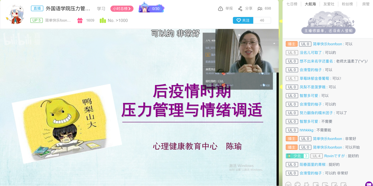 讲座开始前,陈瑜老师指导大家填写了疫情下的压力测试问卷,并通过一张趣味图片引出了“压力”这一主题词,从心理学的角度解释了压力的概念,即“压力就是应激”。随后她结合自己线上对疫区居民进行心理援助和对我校学生开展心理健康疏导的经历,就同学们如何管理压力提出有效建议——优化认知因素、调整应对方式、完善支持系统以及建立多点支撑生活方式。最后介绍了情绪的调适方法,教会同学们理解焦虑及抑郁情绪背后的意义,以及如何应对这些情绪。