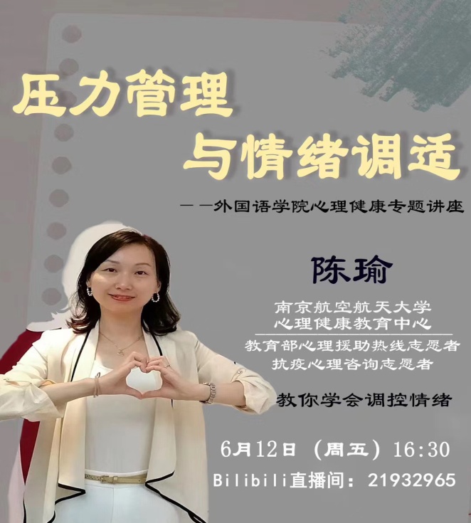 为帮助同学们在后疫情时期学会压力管理和情绪调适,6月12日下午,必赢国际437官网面向全院本研学生开展了线上心理健康专题讲座。本次讲座邀请了南京航空航天大学学生处心理健康教育中心陈瑜老师,从压力的概念、压力与应对、情绪调适方法三个方面指导同学们如何调控自身的情绪。