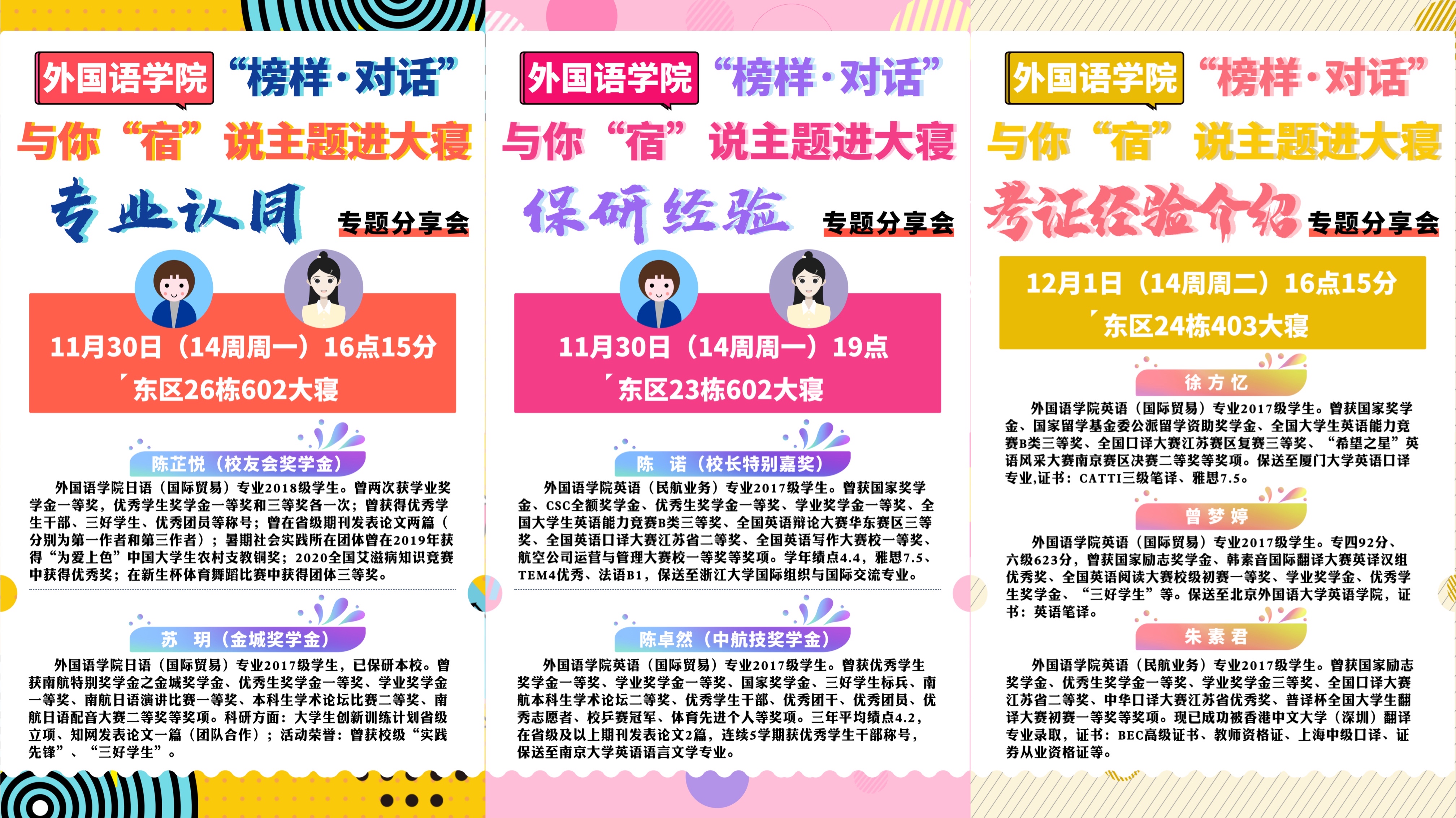为有效解答低年级专业学习和未来选择的困惑,必赢国际437官网近期开展了3期“榜样·对话” 之与你“宿”说主题进大寝专业学习专题系列分享会。辅导员与高年级优秀学长学姐走进不同宿舍,分别从专业认同、保研经验、考证经验这三个方向与低年级学生们展开深入交流。