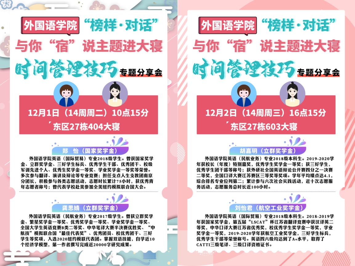 第一期分享会邀请了2019-2020学年国家奖学金、立群奖学金获得者郑怡、龚思婧,她们分享了自己大学期间的所得所失,帮助同学们深刻理解时间管理的重要性;同时,就考研、就业、出国三个方向与新生们展开讨论,为不同意向的学生提出四年时间规划的建议,希望同学们尽早朝着自己的意向目标前进。同学们反响热烈,积极提问。