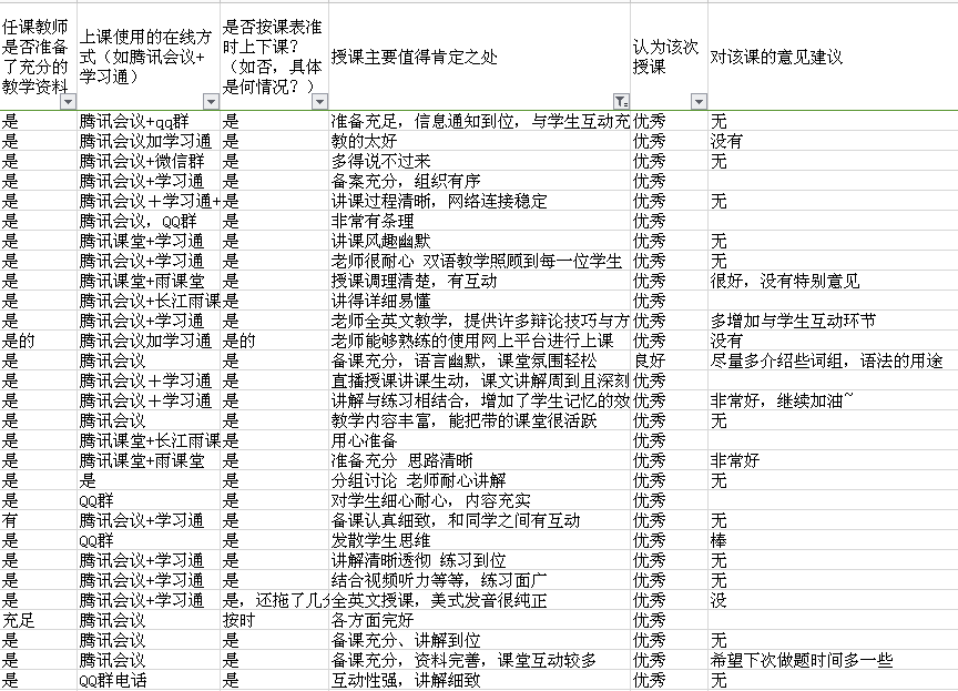 学院教学办用WPS小程序提前设计了1-2周在线教学情况学生反馈表,覆盖每个教学班的第一次课,请双号学生课后匿名提交,统计内容包括教师是否准备了充分的教学资料,是否准时上下课,所用在线方式,教学效果等,教学办实时掌握教学情况,收集并反馈学生评价和意见建议,截至3月3日中午已收到1200多条反馈,其中91%认为授课情况优秀。