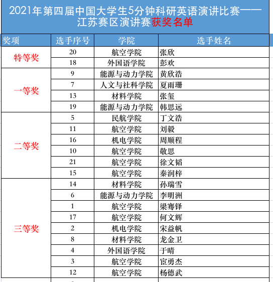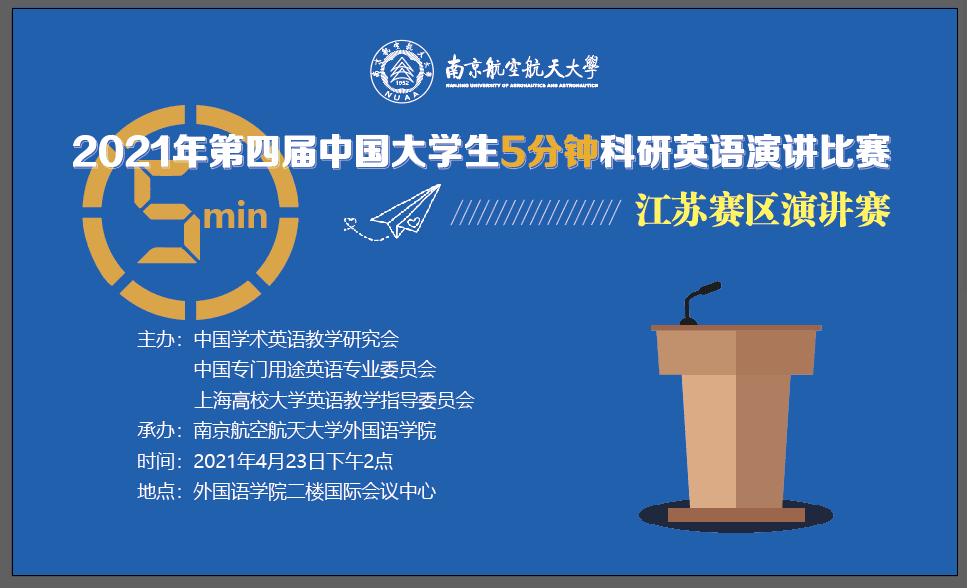 2021年第四届中国大学生5分钟科研英语演讲比赛—江苏赛区演讲赛是基于去年南航学术英语演讲大赛的延伸,活动得到了中国学术英语教学研究会、中国专门用途英语专业委员会、上海高校大学英语教学指导委员会,以及南京航空航天大学研究生院的大力支持。本次大赛吸引了我校来自20几个不同专业的约700名研究生报名参加初赛,通过第一轮筛选,共118名选手的演讲视频入围复赛。在相关教师指导下,入围选手对参赛作品进一步打磨,在第二轮评审后共推荐46名硕博研究生基于自己或团队的原创科研成果进行了专业的视频录制,并提交了参赛作品。最终经英语老师和专业评委的综合评审,共21名同学晋级现场决赛。
