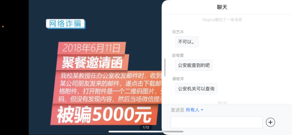 5月12日晚,我院组织举办了防电信网络诈骗安全教育讲座,主讲嘉宾为南航保卫处治安管理科科长、2020“感动南航”年度人物周栋栋。学院党委书记左彤云、教职工代表和学生代表共同参与,本次活动采取腾讯会议的方式。