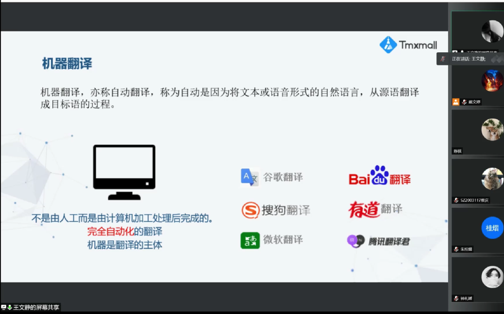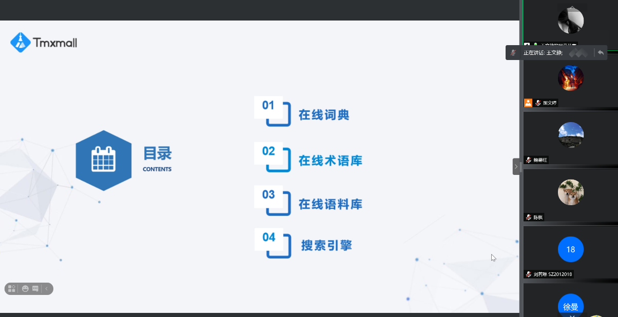 7月8日晚7点,上海一者信息科技有限公司高级运营经理王文静应必赢国际437官网邀请,为20级MTI研究生带来了一堂精彩的线上讲座。王经理曾参与多个大型特色语料库建设项目,擅长语料库的生产制作及检索分析,并熟悉各类主流计算机辅助翻译工具实践应用,本次她带来的讲座主题为“信息检索与机器翻译译后编辑”。
