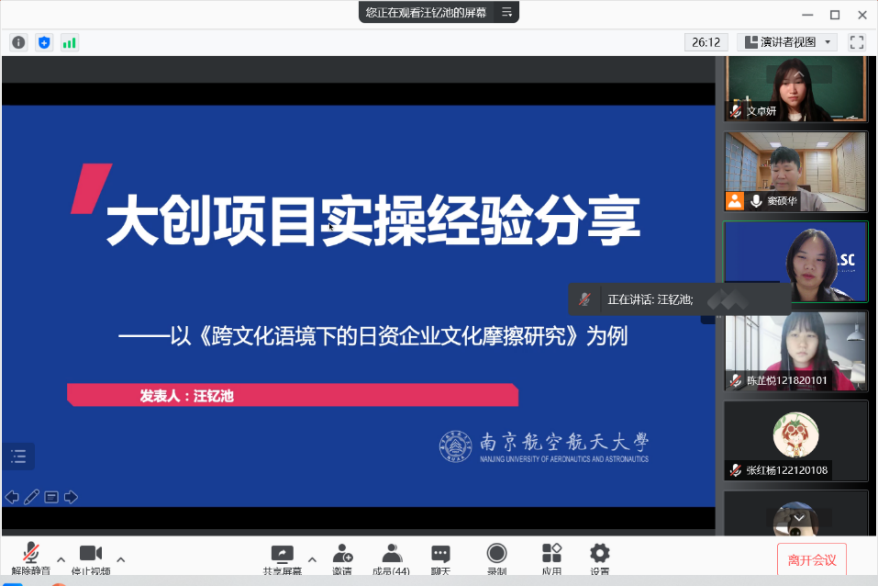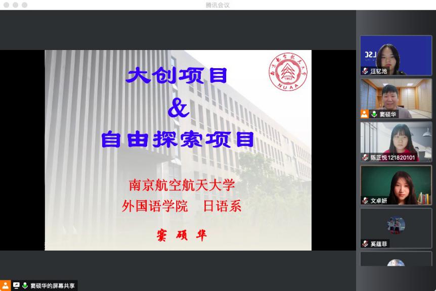 10月19日下午,必赢国际437官网日语系主任窦硕华副教授与汪钇池、陈芷悦和文卓妍同学组成宣讲团向全院学生介绍了大学生创新训练计划项目及自由探索项目。宣讲会通过腾讯会议模式开启,英语系、日语系同学及部分本科生导师参加了会议。