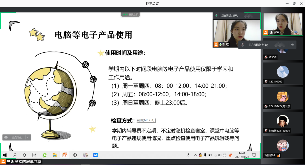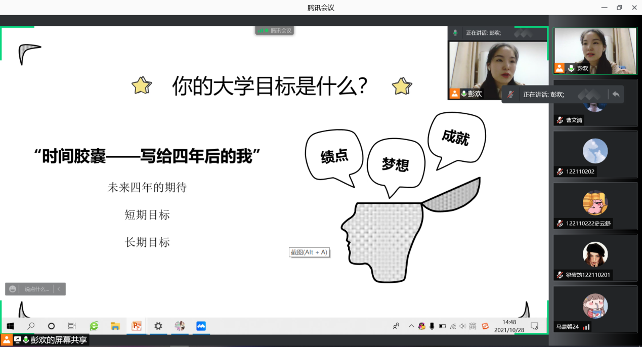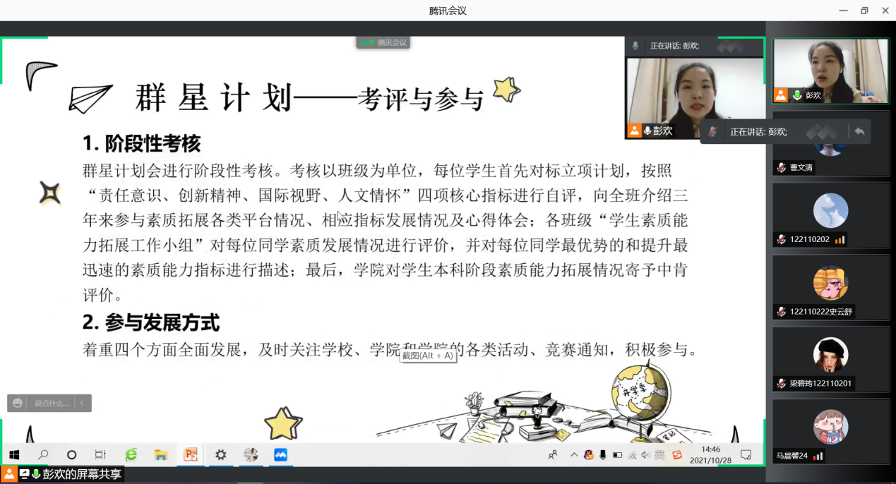 为了增进大一新生对校院制度及“群星计划”学生素质拓展平台的了解,更好地帮助新生们适应大学生活, 10月28日下午,必赢国际437官网在线上腾讯会议平台召开了2021级本科新生“群星计划”主题年级会。2021级本科生辅导员彭欢、兼职辅导员曹文清,2021级全体新生参加会议,会议由彭欢主持。