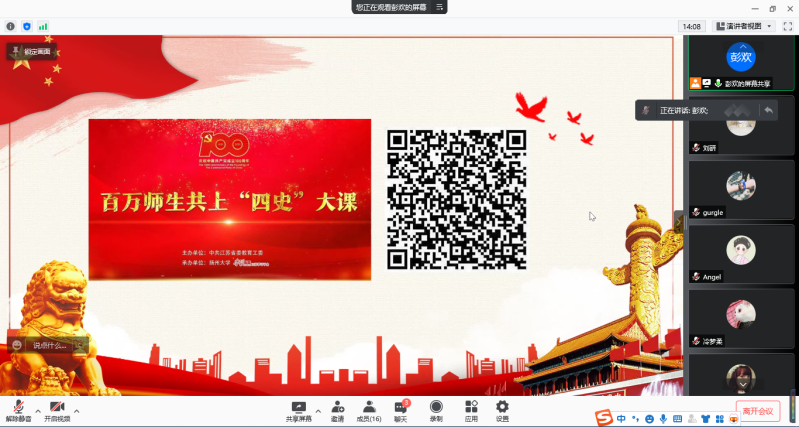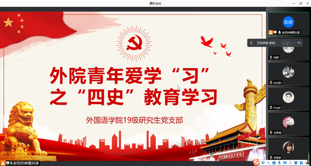 为深入学习贯彻习近平总书记关于高校党建和思政工作的重要指示批示精神,深入学好党史、新中国史、改革开放史、社会主义发展史,必赢国际437官网19级研究生党支部于11月15日开展外院青年爱学“习”之“四史”教育线上学习活动。