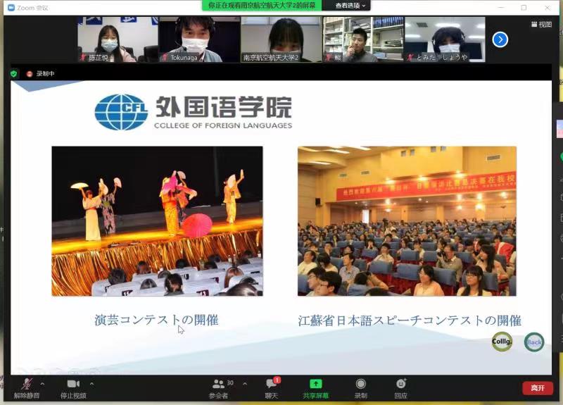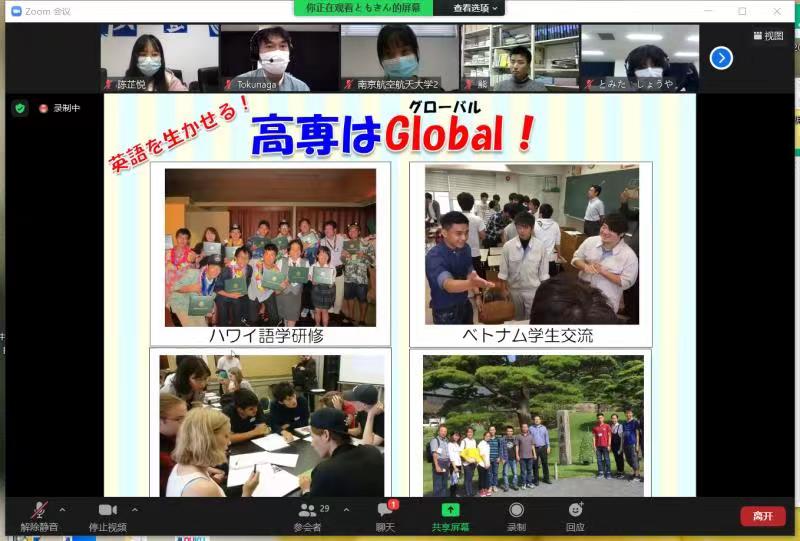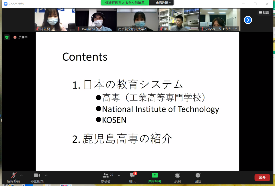交流会以Zoom在线形式开启,全程使用日语。必赢国际437官网日语系主任窦硕华老师、副主任钟勇老师、人文学院法律系洪骥老师(本校日语系毕业)、日语系研究生、本科生共计12名同学及鹿儿岛高专2名老师、13名同学参加了交流会。