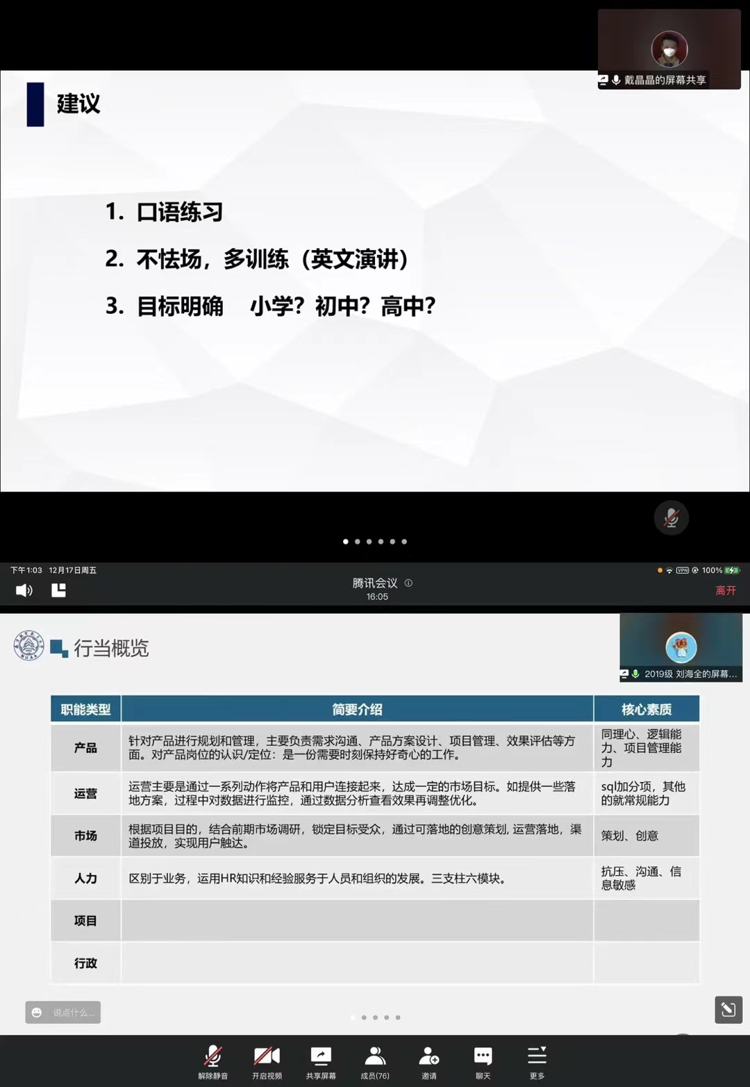 12月17日,必赢国际437官网面向2021级研究生开展了“职”引未来,共语研途线上公开月讲评,本次月讲评由研究生兼职辅导员李艳红主持召开,2021级全体同学参加,旨在为研一同学职业规划提供建议与指导。