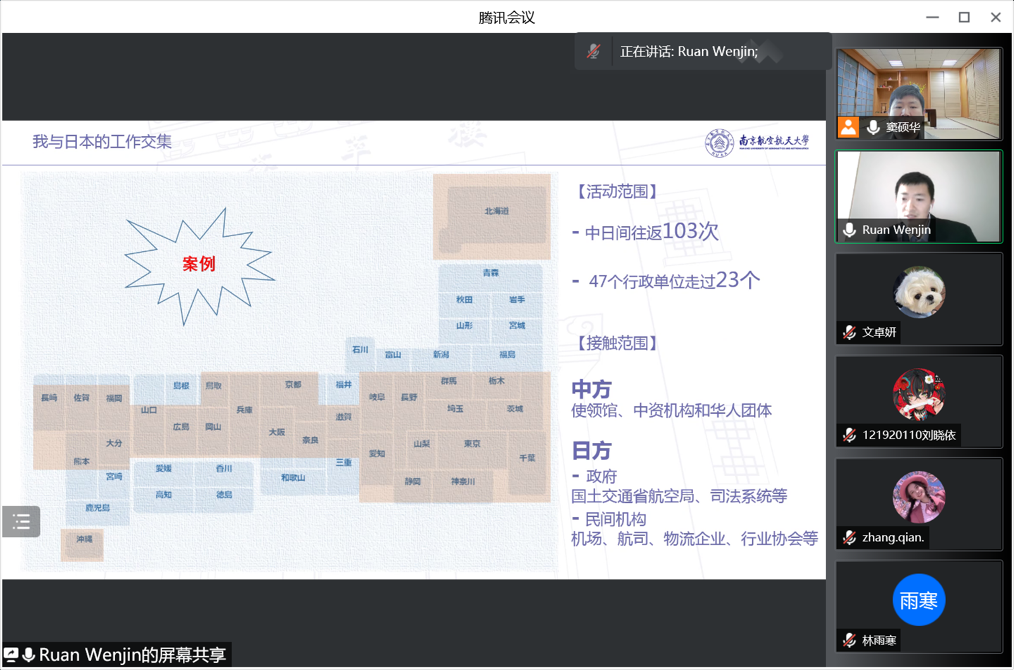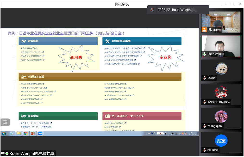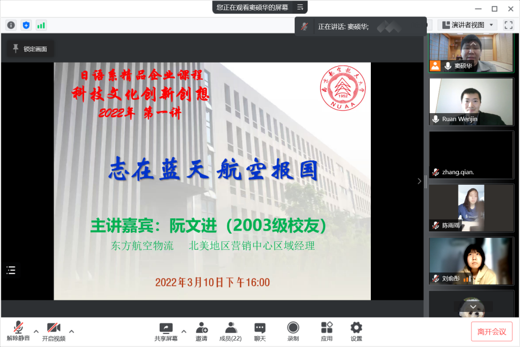 3月10日下午4:00,必赢国际437官网日语系科技文化创新创想课程2022年度第一讲通过腾讯会议成功进行,主题为《志在蓝天,航空报国》。主讲嘉宾为03级日语系校友阮文进,现任东方航空物流北美地区营销中心区域经理。