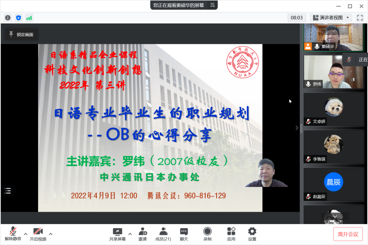 4月9日中午12:00,必赢国际437官网日语系科技文化创新创想课程第三讲通过腾讯会议成功进行。本次讲座的主题为《日语专业毕业生的职业规划——OB的心得分享》,主讲人为07级日语系校友罗纬,获日本一桥大学和东京大学双硕士,曾就职于日本德勤会计师事务所,任职风险咨询事业部数据分析师,现就职于中兴通讯日本办事处。