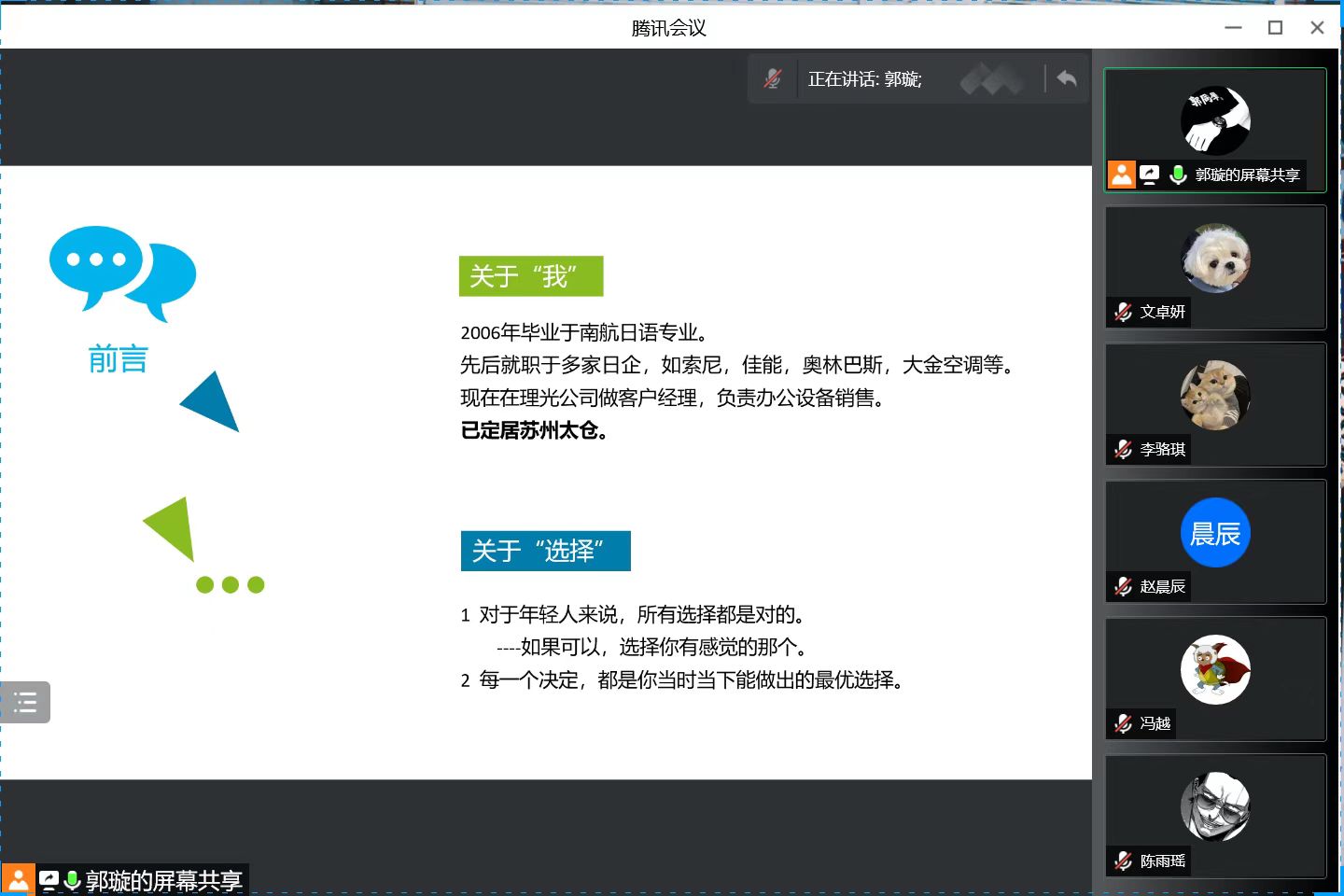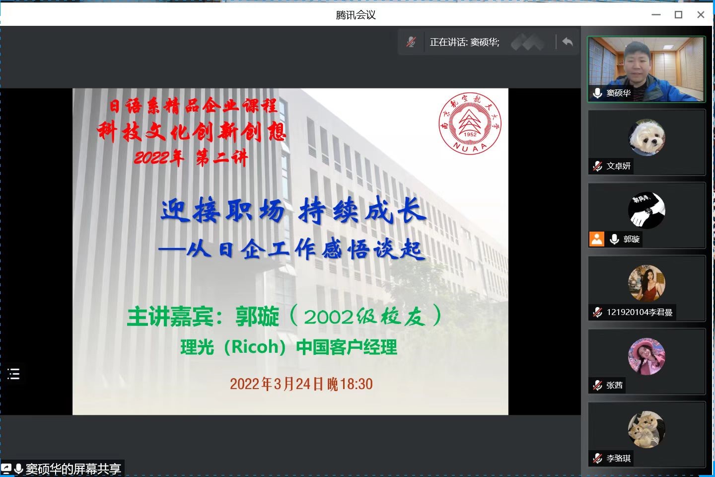 3月24日下午6:30,必赢国际437官网日语系科技文化创新创想课程2022年度第二讲通过腾讯会议成功进行,主题为《迎接职场,持续成长——从日企工作感悟谈起》。主讲嘉宾为日语系02级校友郭璇,现任理光(Ricoh)中国客户经理。