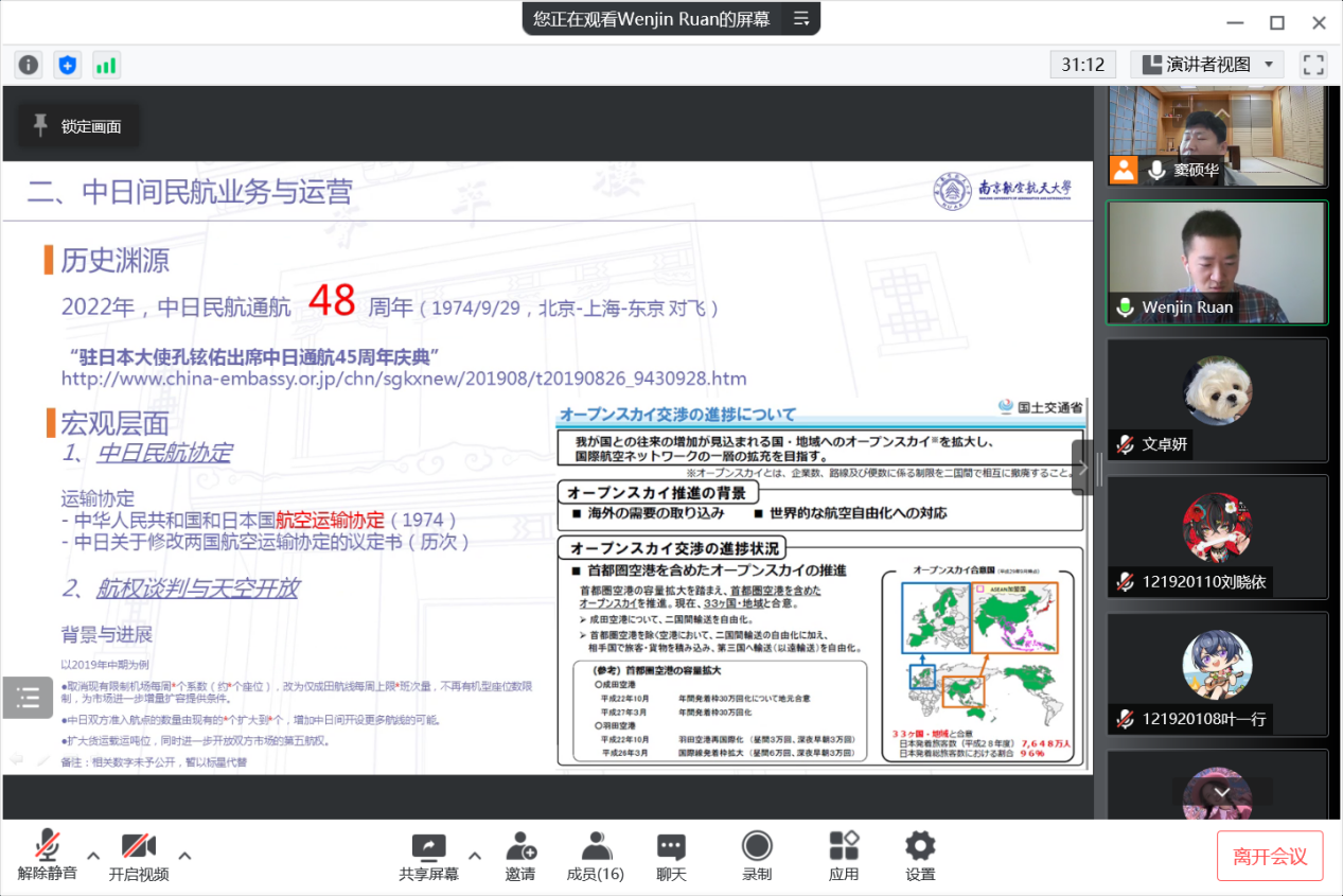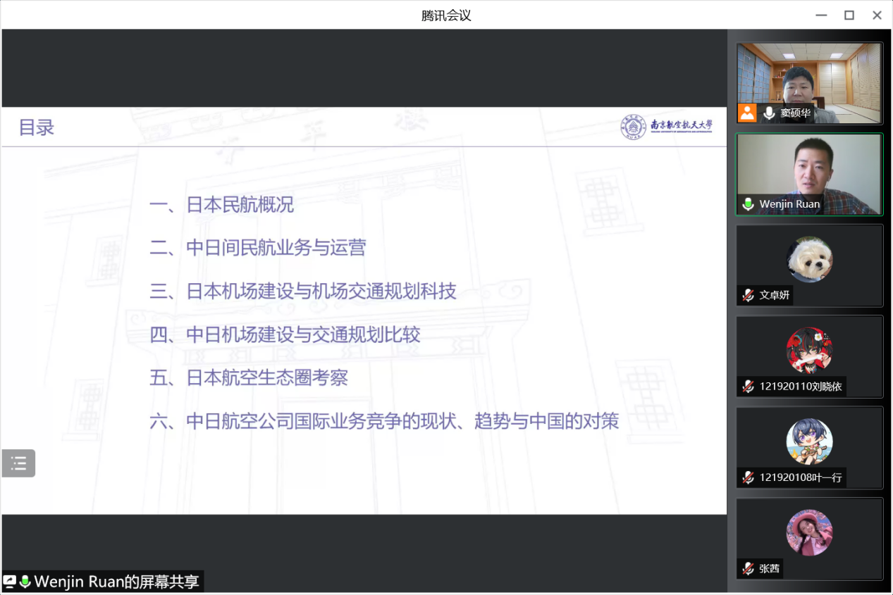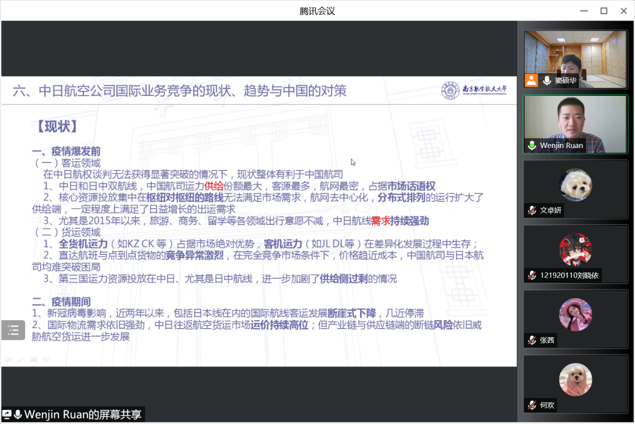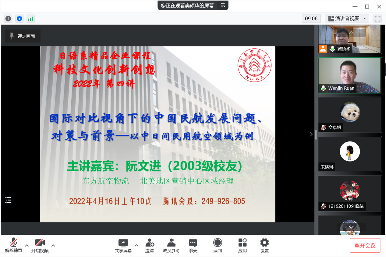 4月16日上午10点,必赢国际437官网日语系精品企业课程《科技文化创新创想》2022年度第四讲通过腾讯会议成功进行,本次主题为《国际对比视角下的中国民航发展问题、对策与前景——以中日间民用航空领域为例》。主讲嘉宾为03级日语系校友、现就职于东方航空物流北美地区营销中心的阮文进经理。