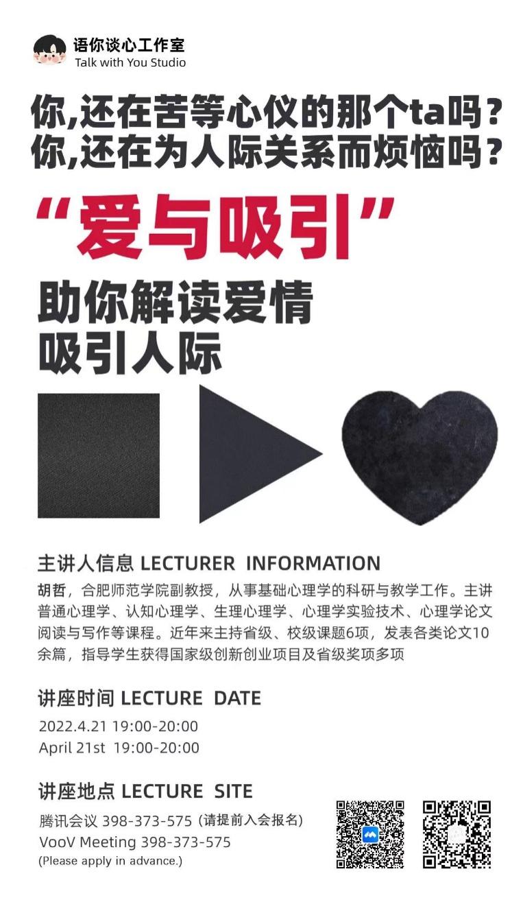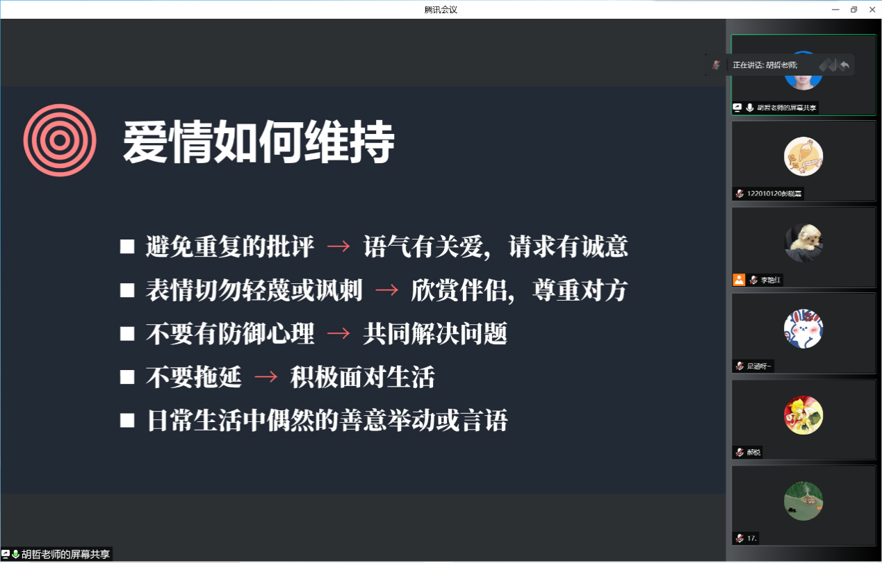 为帮助同学们处理好人际关系、解读爱情难题,4月21日,必赢国际437官网心理工作坊特邀合肥师范学院副教授胡哲老师任主讲嘉宾,开展了题为“爱与吸引”的线上心理健康讲座。学院团委书记、研究生辅导员李萍,全体心理委员及感兴趣的同学参加了此次讲座。