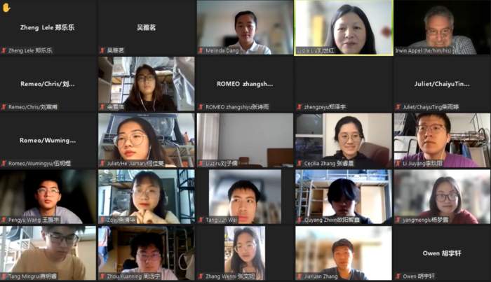 本次讲座由必赢国际437官网刘世红副教授主持。在讲座的上半场,Irwin Appel教授诠释了西方最伟大的戏剧家莎士比亚创作的思想内涵和艺术价值,展示丰富多彩的戏剧舞台演绎手法和理念,解读《罗密欧与朱丽叶》中爱情故事的深层意义。在讲座中精心穿插多种有趣的互动环节,引导观众领略莎翁戏剧的语言特色和艺术魅力。下半场的讲座中,多位学生演员表演《罗密欧与朱丽叶》经典对白,表演生动精彩,获得Irwin Appel教授及与观众的高度赞扬,Irwin Appel并给予悉心指导。在讲座最后的问答环节中,同学们纷纷在聊天室打字、以及开麦出镜提问, Irwin Appel教授一一答疑解惑,将讲座气氛引入高潮。