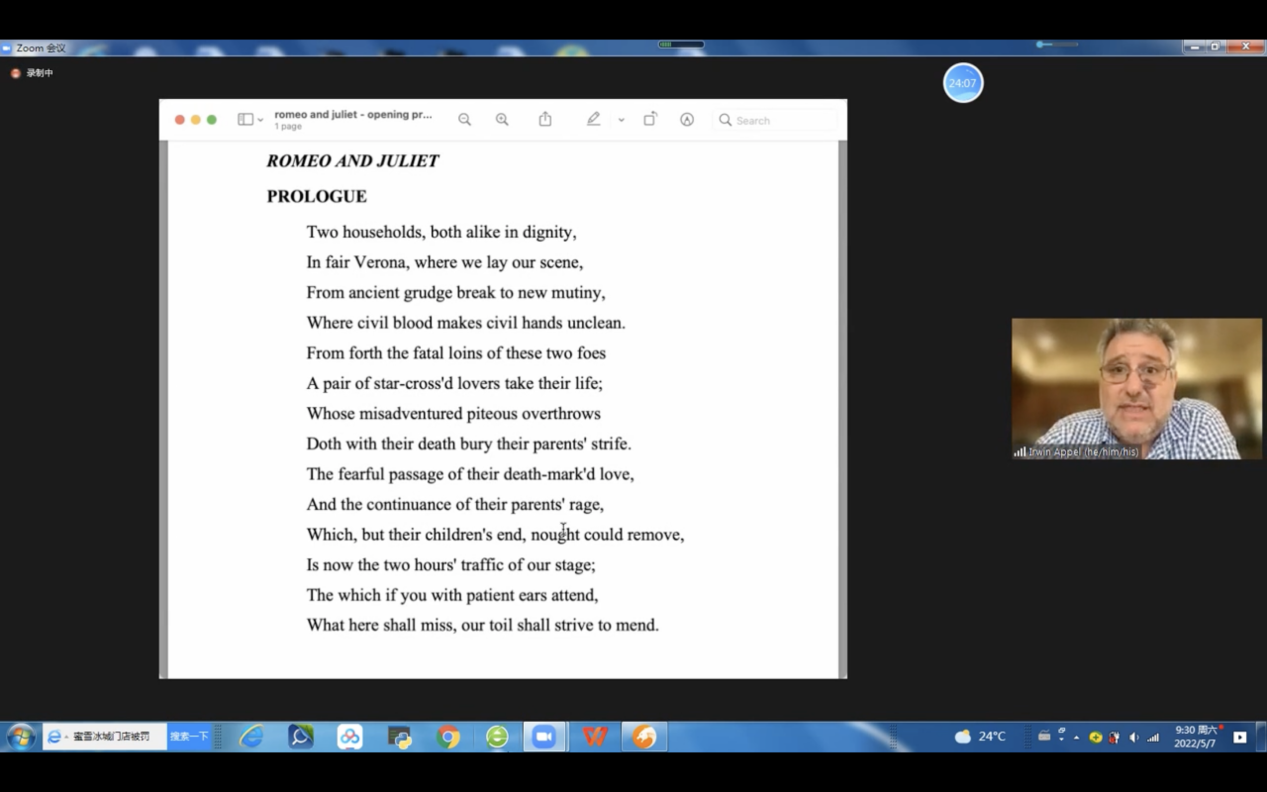 2022年5月7日上午,由必赢国际437官网主办,邀请美国著名导演、加州大学圣芭芭拉分校戏剧与舞蹈系主任Irwin Appel教授为我校师生讲解莎翁戏剧,这是该教授在本学期第二次讲授戏剧专题。此次讲座的主题为“莎士比亚戏剧在南京:《罗密欧与朱丽叶》赏析”,为必赢国际437官网举办的“海外名家讲坛”系列讲座之一。我校师生们对莎翁戏剧热情不减,积极参与,气氛热烈融洽,讲座获得圆满成功。