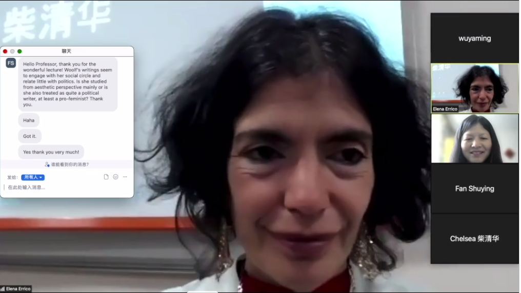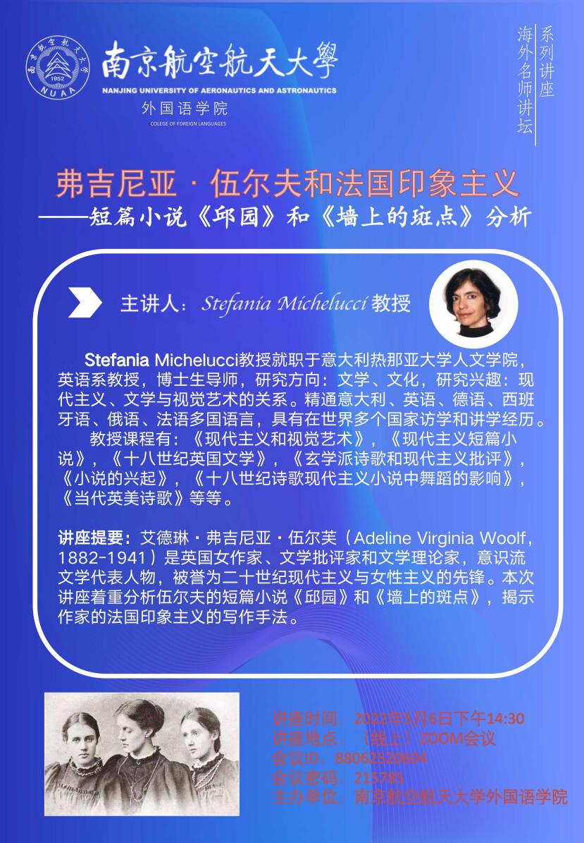 2022年5月6日下午14:30,必赢国际437官网主办了又一场”海外名家讲坛”系列的跨境线上讲座,主讲人为意大利热那亚大学校长助理、人文学院英语系教授Stefania Michelucci,讲座主题为“弗吉尼亚·伍尔夫和法国印象主义—短篇小说《邱园》和《墙上的斑点》分析”。本次讲座别开生面,不仅有南航、南农师生等高等院校通过线上形式参与,同时意大利热那亚大学师生在线上和线下聆听,是一场中意师生共同参与的线上国际课堂。