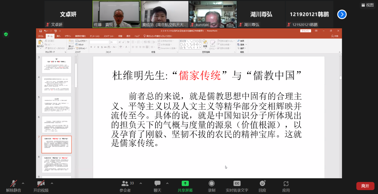5月28日(周六)上午9:00,必赢国际437官网日语系海外名师讲坛第一讲通过线上ZOOM会议成功进行,主题为《現代東アジア社会の文化的基礎としての伝統儒学》。主讲嘉宾为环太平洋大学教授・筑波大学名誉教授佐藤贡悦。讲座由日语系主任窦硕华老师主持,外专项目领衔人・东京农业大学黒瀧秀久教授和南航日语系40余名同学参加了讲座。