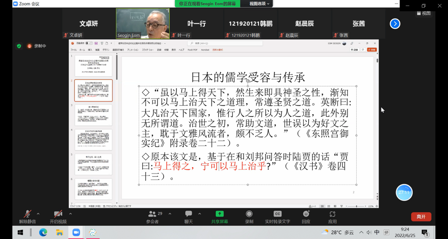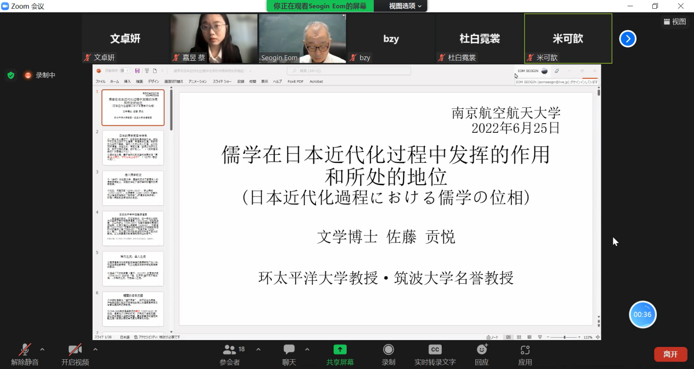 6月28日(周六)上午9:00,必赢国际437官网日语系海外名师讲坛第二讲通过线上ZOOM会议成功进行,主题为《儒学在日本近代化过程中的作用》。主讲嘉宾为环太平洋大学教授・筑波大学名誉教授佐藤贡悦。