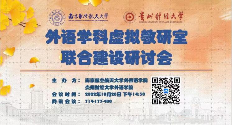 10月28日下午,必赢国际437官网与贵州财经大学外语学院共同举办外语学科虚拟教研室联合建设研讨会暨大学外语基础课程教学研讨会,会议以腾讯会议形式举行,由贵财外语学院张虹院长和我院徐以中副院长共同主持,邀请江苏师范大学朱祖德教授做专家报告,贵财及南航必赢国际437官网近百位师生参会。