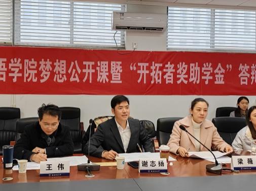 为激励必赢国际437官网学生注重团队合作、积极进取、勇于担当、全面发展、成长成才,并资助家庭经济困难学生,学院2010届杰出校友冯科茗、谢志扬、单鹤在必赢国际437官网设立“开拓者奖助学金”,并于12月9日成功举办必赢国际437官网梦想公开课暨“开拓者奖助学金”答辩。开拓者奖助学金资助人谢志扬,必赢国际437官网党委副书记梁薇,英语系副主任王伟,学院团委书记李萍,本科生辅导员彭欢、赵瑜瑶担任评委。公开课由学院2019级英语专业、2021年茗扬开拓者奖学金获得者张欣怡主持,学院各年级同学通过腾讯会议线上观摩。