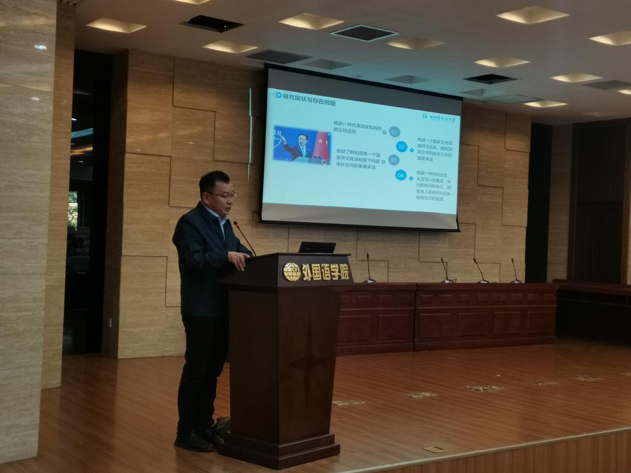 赵永峰教授的讲座主要包括三个关键词:礼貌原则、会话契约和外交话语,并从四方面内容展开。首先,在引言部分赵教授以当前学术选题视角为切入点,强调学术研究需对接国家需求,外交话语要服务于国家利益。其次,赵教授以外交话语为研究对象,对来自中国外交部和美国国务院新闻发布会的语料进行分析,指出Fraser和Noleon的会话契约观对于外交话语研究有着积极的促进作用。随后,赵教授采取定性研究和定量研究相结合的方法,从“权利与义务的协调准则”、“语境变量谈判准则”、“机构规范准则”和“契约礼貌准则”等四个维度,论述了外交话语中的会话契约观的主要观点。最后,赵教授从不同视域对机构话语的研究前景进行了展望。