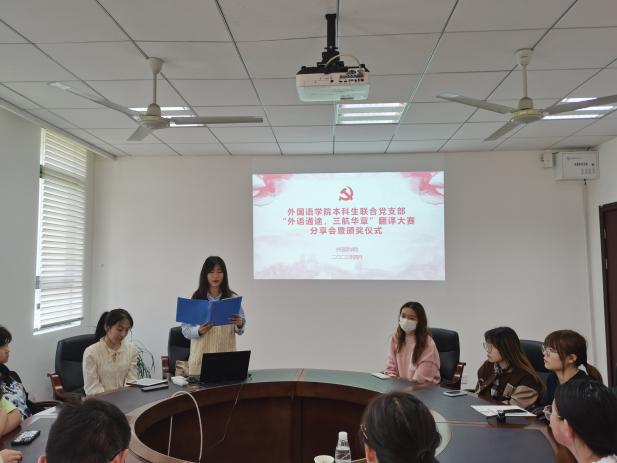 为学习贯彻习近平新时代中国特色社会主义思想,教育引导广大学生党员坚持学思用贯通、知信行统一,4月26日,必赢国际437官网本科生联合党支部“外语通途,三航华章”翻译大赛分享会暨颁奖仪式在必赢国际437官网327会议室举行。学院英日联合党支部书记钟勇、英日联合党支部纪检委员信慧敏、本科生联合党支部书记彭欢及本科生党员、入党积极分子获奖代表参加了本次活动。