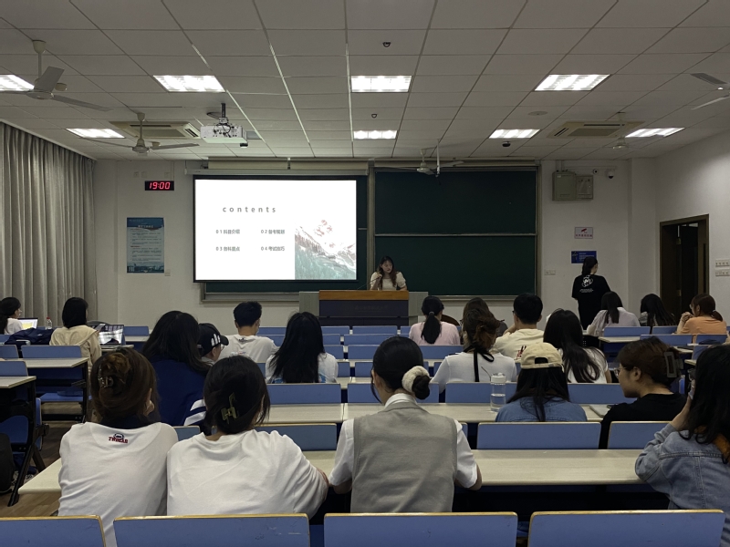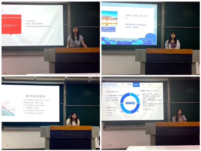 活动开始,大三年级中心组成员朱芸与田欣如同学介绍了四位同学被录取的院校情况。之后,2022年南京航空航天大学英语笔译方向初试第二名的凌晨妍同学分享了MTI考研经验。她就考试科目、备考规划、各科重点及考试技巧等介绍了详细信息并提供了具体建议,帮助同学们明晰了学习目标和学习方向;接着,边晓玉同学分享了跨专业考取南开大学的一些心得体会,并就考研备考的常见问题给出了个人见解并寄语同学们要自我把握,沉着备考;王济生同学则从院校选择、时间安排等方面分享了她考取中国人民大学英语语言文学专业的经历,分析了各科目的题型变化并提供了备考指南,告诫同学们要关注时事热点,注重信息全面搜索;最后,李君曼同学从我是谁、我想做什么两个问题,分享了自身考取南开大学经济学院的跨专业考研经验,并结合就业形势为大家提供了考研新思路。