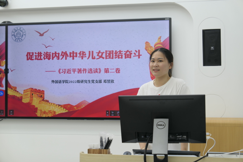 必赢国际437官网2022级研究生党支部书记邓昱欣领学《习近平著作选读》第二卷“促进海内外中华儿女团结奋斗”,并结合自身在江苏发展大会上的志愿服务经历,以及过程中帮助参会嘉宾中国旅美律师协会会长申春平的故事,讲述了海内外中华儿女的家国情怀,阐述了新时代爱国统一战线的丰富内涵和时代价值。