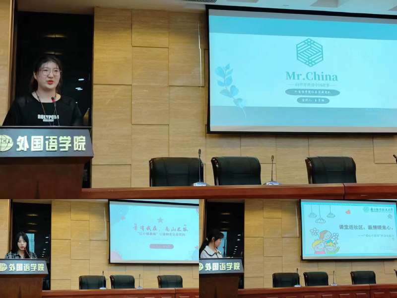 随后,学院2022年暑期社会实践优秀团队Mr. China—向世界讲述中国故事团队、爱心小课堂社区服务团队以及红心暖桑榆助老团队进行了团队实践成果展示与经验分享,详细的介绍为同学们提供了更多的社会实践组织策划及开展的思路。