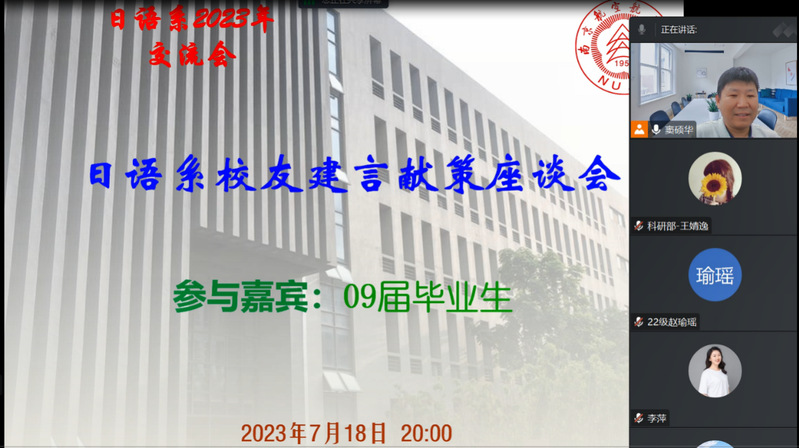 为凝聚校友力量,加强校友联络,促进专业发展,2023年7月18日必赢国际437官网日语系召开校友建言献策座谈会。此次座谈会由必赢国际437官网日语系主任窦硕华主持,必赢国际437官网团委书记李萍、日语系教师王鹏飞、本科生辅导员赵瑜瑶以及4位2009届毕业生参加。
