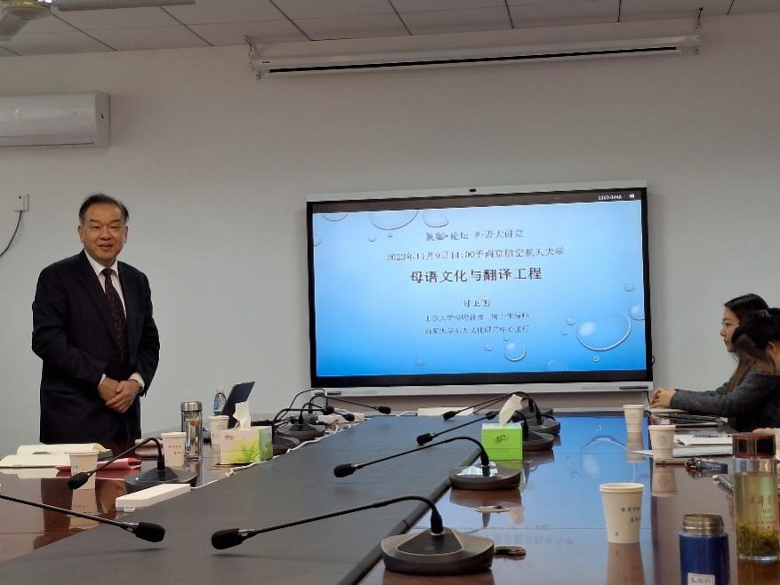 在讲座中,时卫国教授着力从专业、知识与文化三大系统的建构阐述了高质量翻译的实现路径,强调了母语文化建设的重要性、介绍了加强母语文化建设的方法,最后以王国维“治学三境界”结束话题。