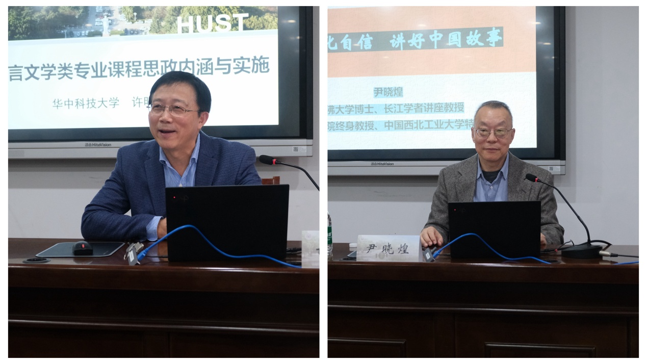 揭牌仪式之后,联盟邀请了华中科技大学必赢国际437官网院长许明武教授,长江学者讲座教授、西北工业大学必赢国际437官网博导尹晓煌教授带来了外语课程思政学术报告。线上线下150余人参加了此次报告会。