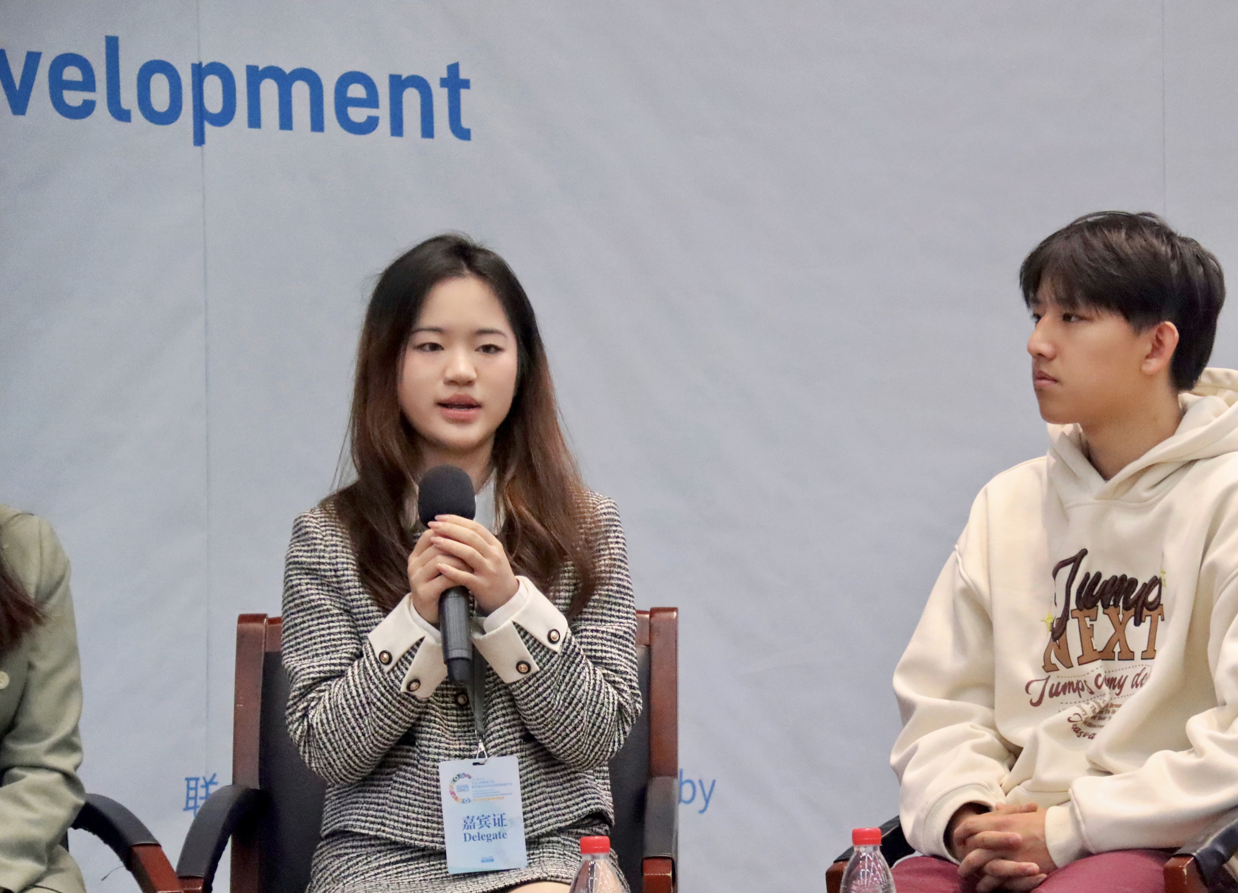 本次会议以“教育变革促进农村可持续发展”为主题,在“青年行动,责任同行”这一分论坛中,学院青年学生代表参与了青年圆桌对话。在分享交流环节,苏露向在座的嘉宾和各国代表分享了学院Mr.China-向世界讲述中国故事团队、模拟联合国团队在推动农村可持续发展所做的努力、取得的成绩和实践经验,用自身经历讲述了如何用教育促进农村可持续发展、并讲好传播好中国乡村振兴等故事,并且着重分享了作为外语学子的她如何将专业所长与社会实践紧密融合,鼓励青年“以知识为伴,与世界同行”。