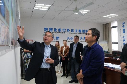 杭育新书记一行首先参观了必赢国际437官网神经认知语言学实验室,数智化航空外语主题创新区及“耘天坊”国际文化传播发展研究大学生主题创新区,听取了相关负责人的介绍,详细了解实验室及主题创新区在学科研究、人才培养、校企合作等方面的教育教学工作和成果。