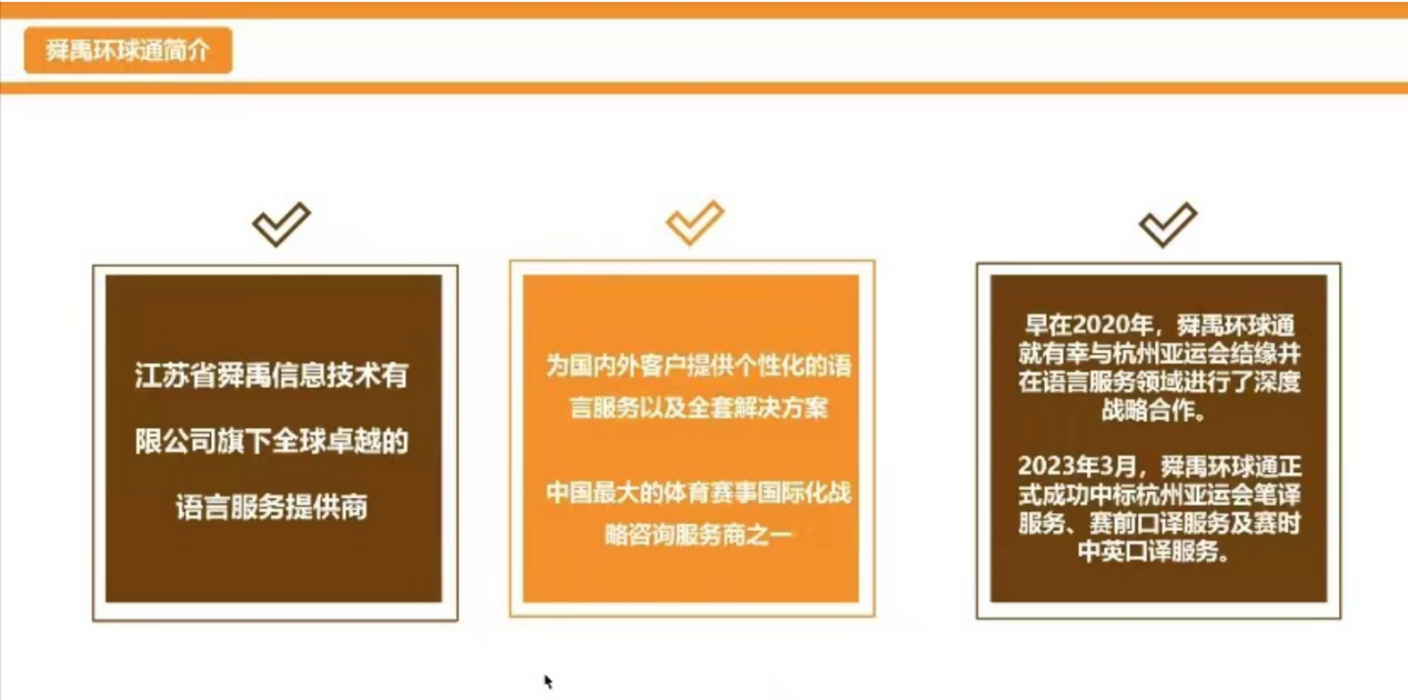2024年5月20日晚,南航必赢国际437官网MTI教育中心邀请了江苏舜禹信息技术有限公司市场运营与口译服务部主管彭蕴博给同学们带来了“基于公示语翻译项目的MTI学生实践能力培养”讲座第二讲。彭经理以杭州亚运会为线索展开,展示了优质语言服务如何助力亚运盛会的成功举办。