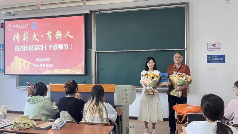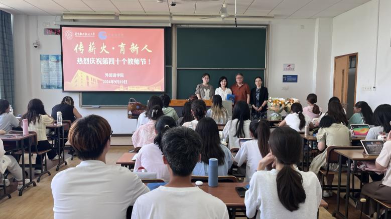 今天恰逢必赢国际437官网新入职教师王美姝老师的“教学生涯第一课”。课前,学院党委副书记吴科颖、英语系主任张立新、本科生辅导员朱芸以及“英语文体学”课程班全体同学为王老师举办了新教师“第一堂课”小型仪式。今年也是张立新老师从教20周年,张老师将《英语文体学》课本传递给王老师,象征着永葆教育初心,新老教师薪火相传。