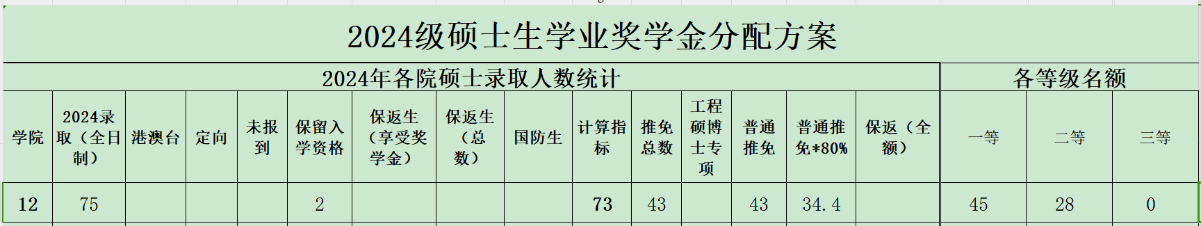 根据以上计算方式,各学科方向各等级奖学金分配名额的计算结果如下表: