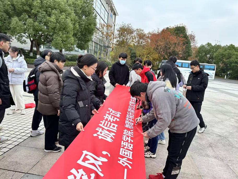 活动特别设置了“诚信考试”横幅,参加活动的全体同学在横幅上签名,共同承诺:诚信考试,从我做起。
